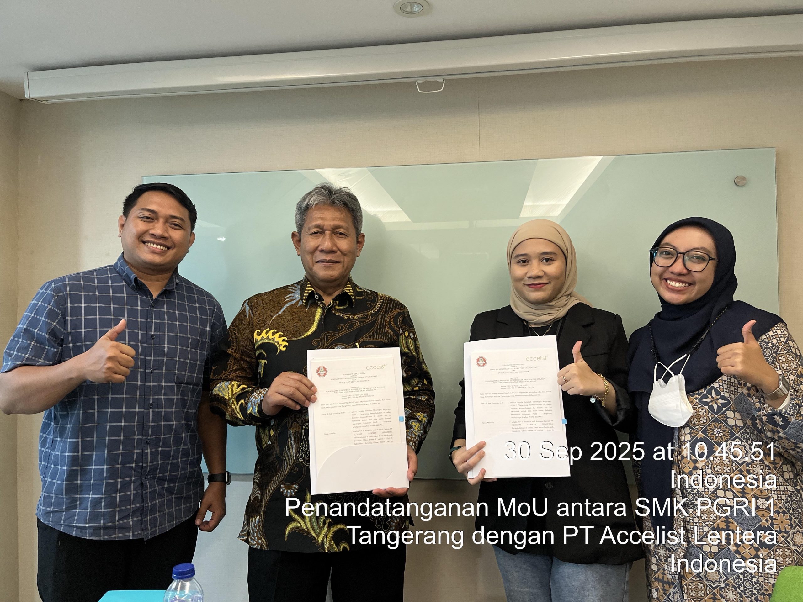 Tangerang – dalam upaya memperkuat sinergi antara pendidikan kejuruan dan dunia industri, pada hari ini di kantor pusat PT Accelist Lentera Indonesia yang beralamat di Brooklyn Office Tower B, Lantai 7, Unit P, Jl. Alam Sutera Boulevard, Pakualam, Kec. Serpong Utara, Kota Tangerang Selatan, Banten 15320 telah dilaksanakan penandatanganan Nota Kesepahaman (Memorandum of Understanding/MoU) antara SMK PGRI 1 Tangerang dan PT Accelist Lentera Indonesia.